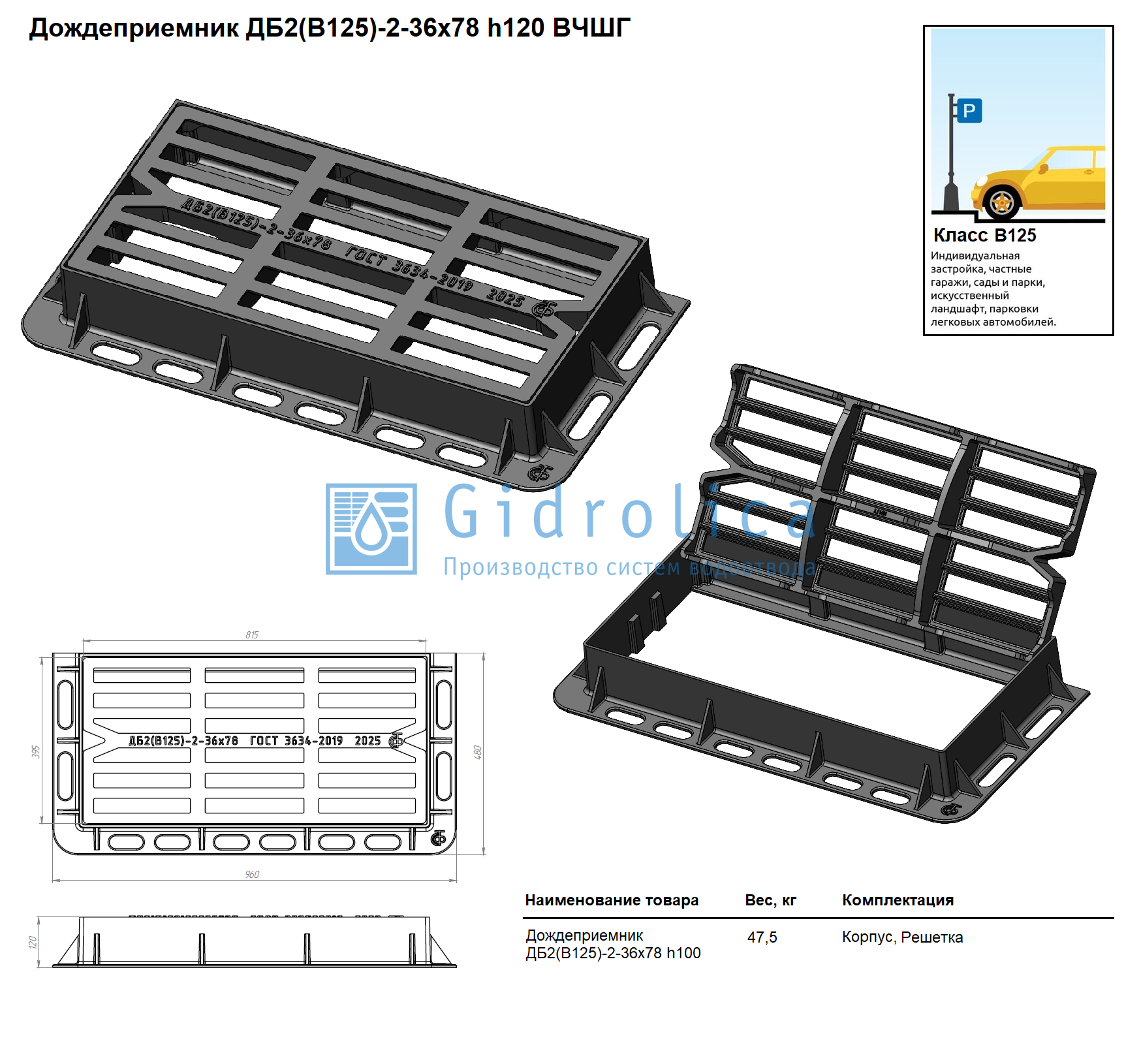 Дождеприемник большой прямоугольный ДБ2(В125)-2-36-78, h120 мм, прямой паз