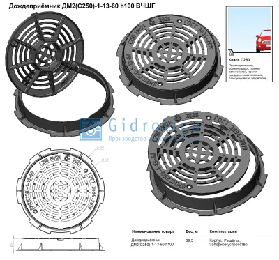 Дождеприемник магистральный круглый ДМ2(С250)-1-13-60, h100 мм