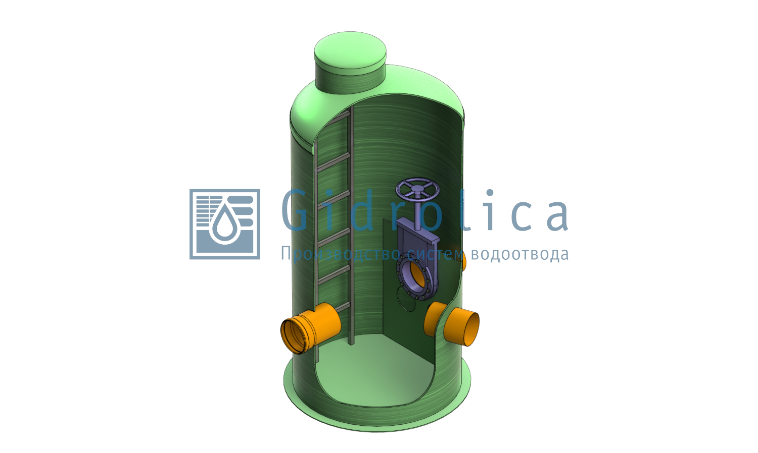 Емкость, несмотря на свои габариты, отличается высокой производительностью. Данная модель дополняется лестницей для удобства проведения профилактических работ. Корпус колодца изготовлен из износостойкого материала, рассчитанного на контакт с агрессивной средой. Емкость дополняется двумя отверстиями для подвода труб, соединенных с канализационной системой.