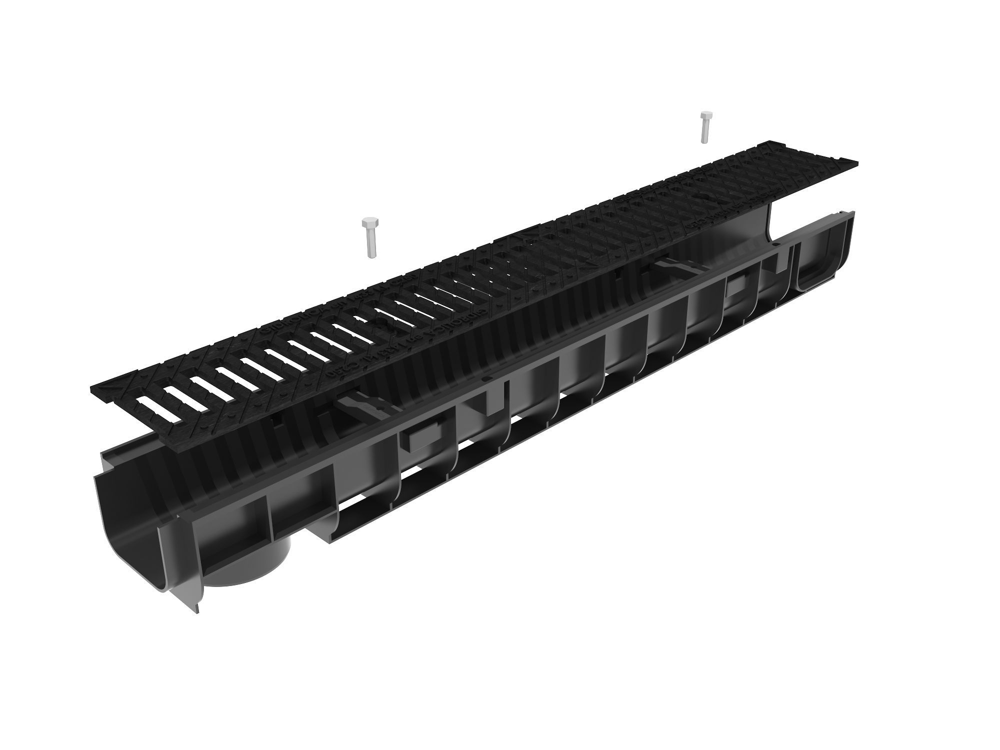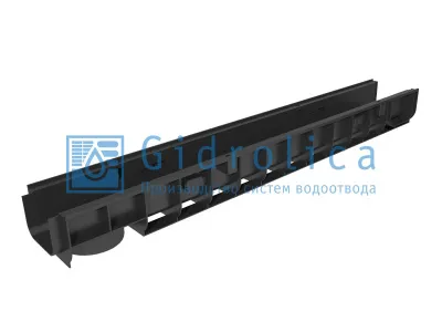Пластиковый водоотводный лоток имеет гидравлическое сечения DN100 и уменьшенную пропускную способность, которая достигается небольшой высотой изделия при стандартных ширине и диаметре впускных/выпускных патрубков.