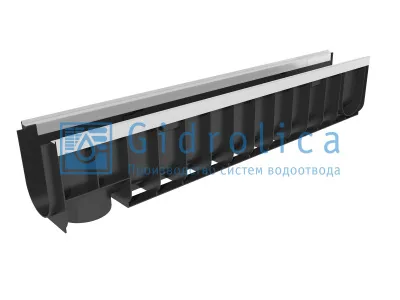 Пластиковый лоток повышенной пропускной способности (до 9 л/мин), усиленный по продольным кромкам металлическими пластинами с выемками под водоприемную решетку, предназначен для установки в местах скопления дождевых/снеговых вод: на тротуарах, по обочинам автодорог небольшой пропускной способности, на автостоянках, предприятиях автосервиса.