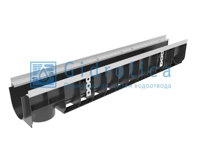 Снабжен стальными направляющими для закрепления водоприемных решеток, держателями, фиксирующими лоток к основанию в продольном и поперечном направлениях. Имеет систему стыковки (торцевую и под углом 900) с аналогичными водоотводными лотками. Оснащен ребрами жесткости по всей длине изделия.