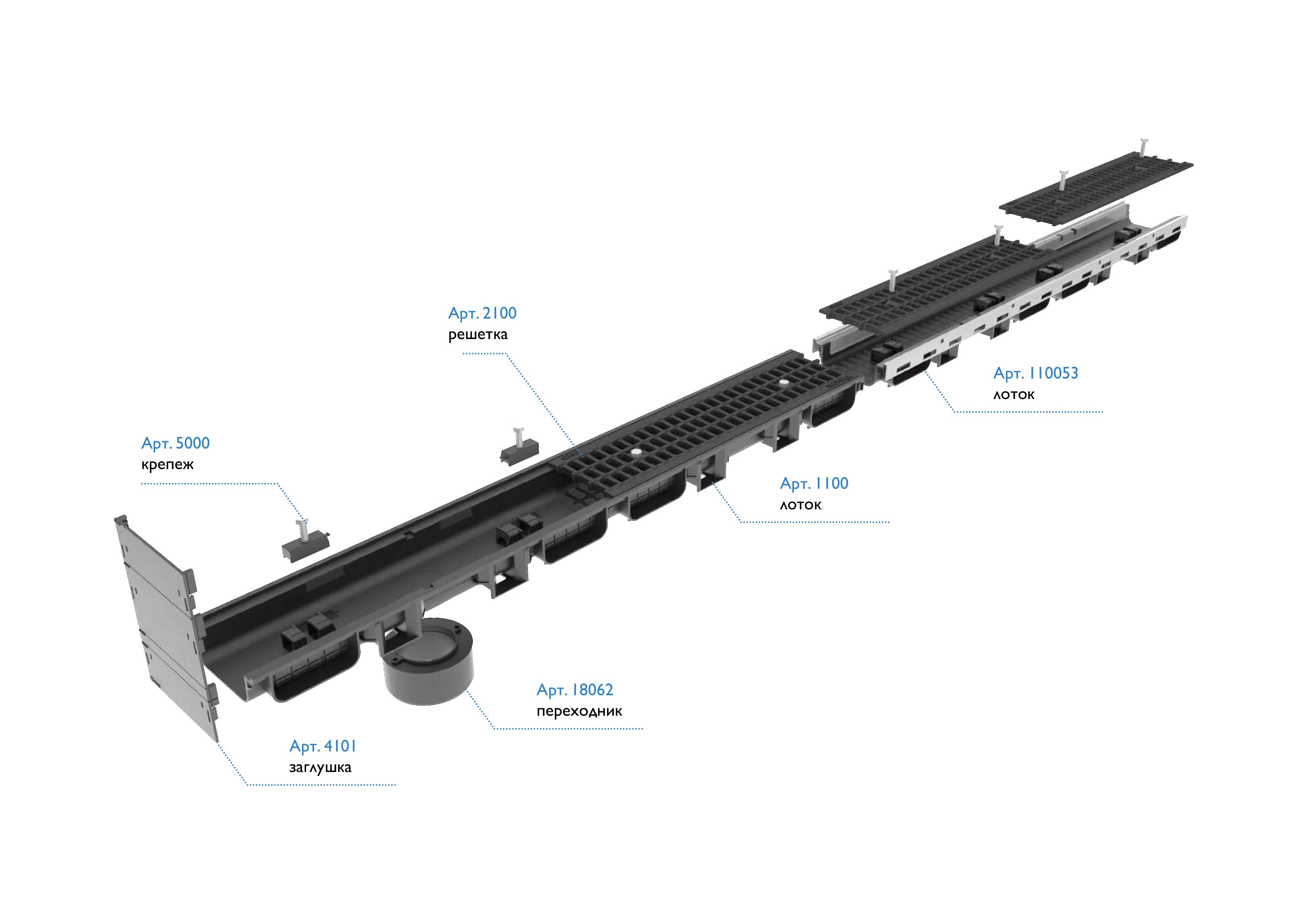 Пластиковый корпус лотка обладает малым весом (всего 1,048 кг), что значительно облегчает транспортировку и монтаж, снижая затраты на установку. Специальная конструкция замков позволяет легко стыковать элементы лотков, обеспечивая герметичность и надежность системы водоотведения. Лоток оснащен съемными решетками, которые упрощают доступ для удаления грязи и мусора из канала.