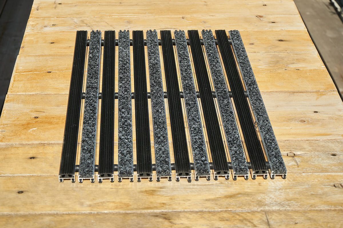 Цельноалюминиевая решетка системы грязезащиты Gidrolica®Step стандартными габаритами 390х590 мм состоит из металлических блоков с замками и вставных модулей из резины и текстиля. Вставки съемные, могут легко демонтироваться, промываться и чиститься.