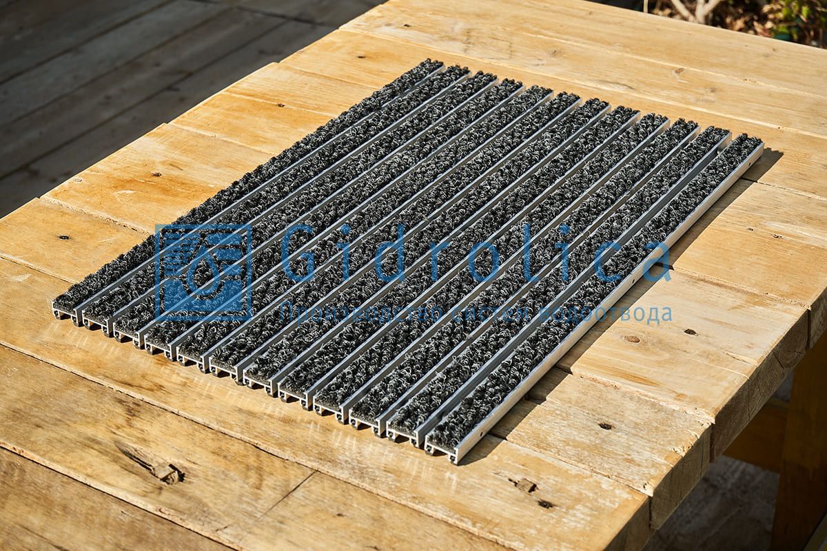 Цельноалюминиевая решетка габаритами 390х590 мм серии Gidrolica®Step со съемными текстильными блоками шириной 27 мм выполняется с пазами для облегчения монтажа/демонтажа и чистки грязезащитных блоков. Расстояние между вставками 7 мм.